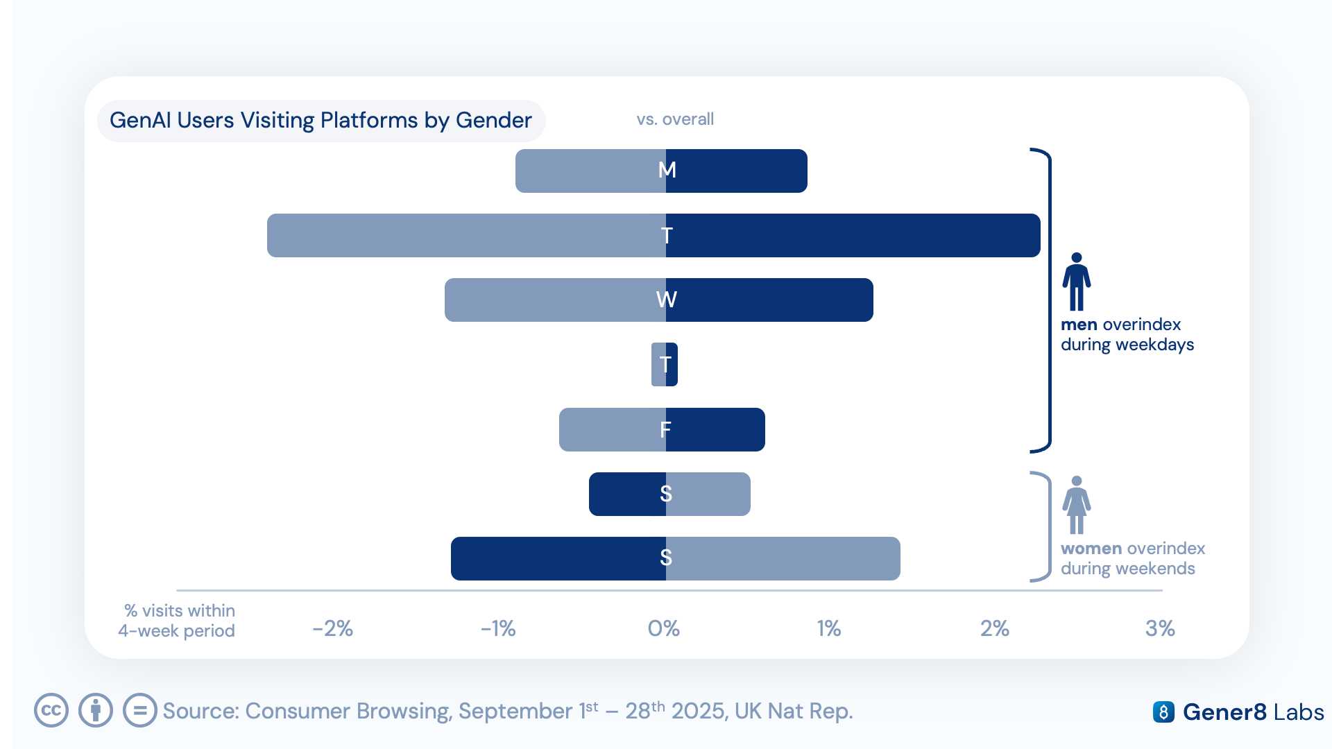 When we segment by demographics, really interesting patterns emerge, suggesting that for many, GenAI is firmly a tool of the ‘work week’.
