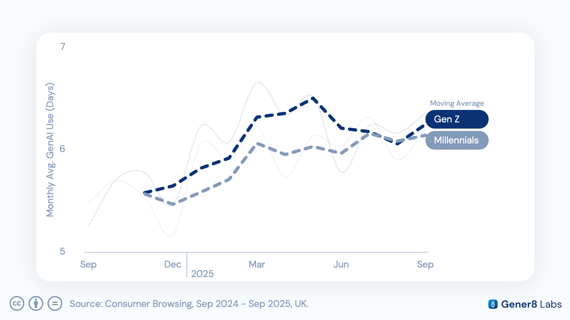 Our data showed that Gen Z lead GenAI usage at an average of 6.3 days per month, with Millennials following closely behind. When viewed together, these two younger cohorts average almost an entire day (or +18%) more of GenAI usage per month than Gen X users.