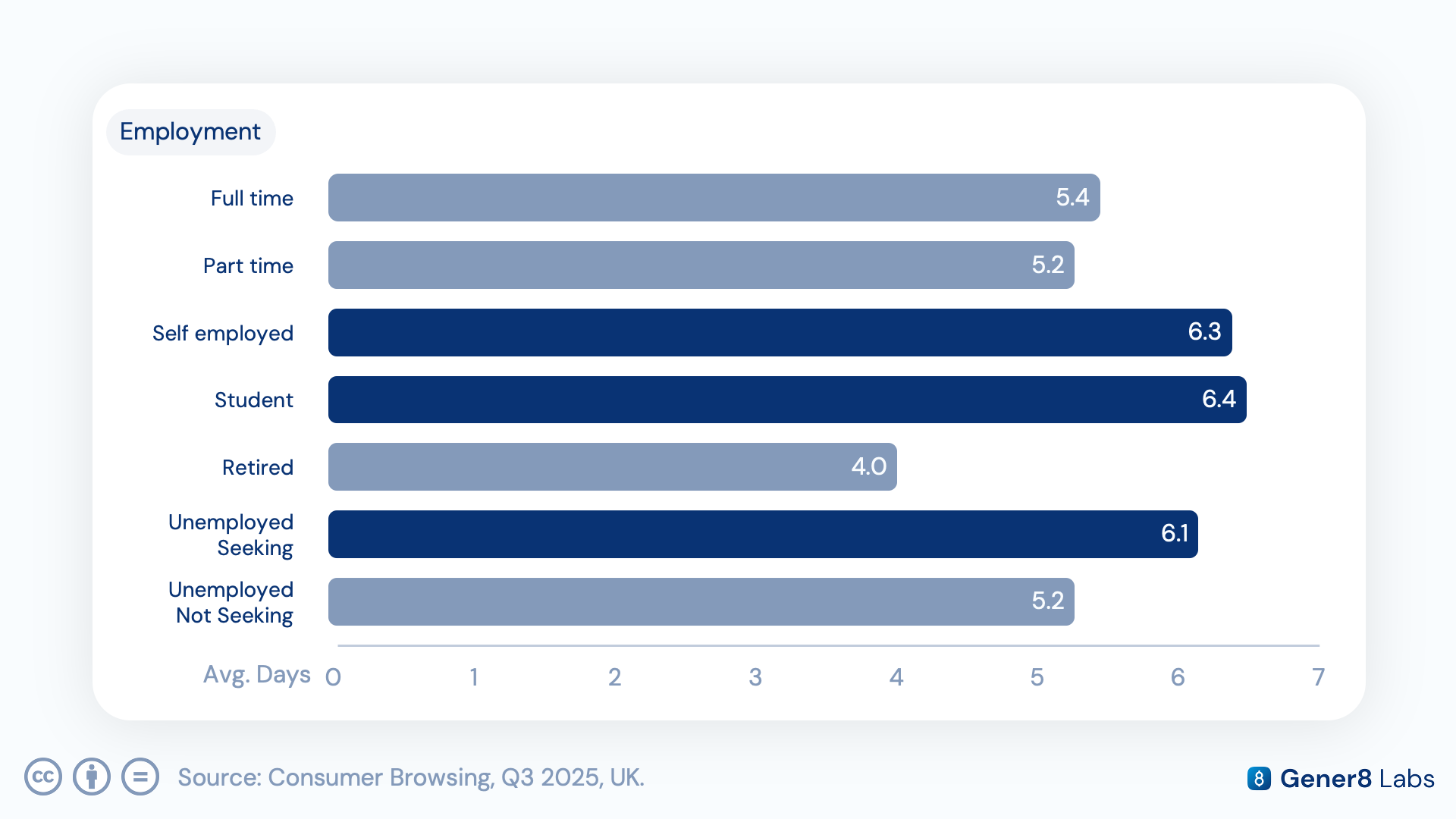 The data identifies those actively seeking employment as another high-frequency user group, averaging 6.1 days of use per month. Their engagement is notably intense, with this cohort using GenAI 15% more than those who are unemployed and not seeking a job. This behaviour is driven by the clear utility AI offers in navigating the modern job market.