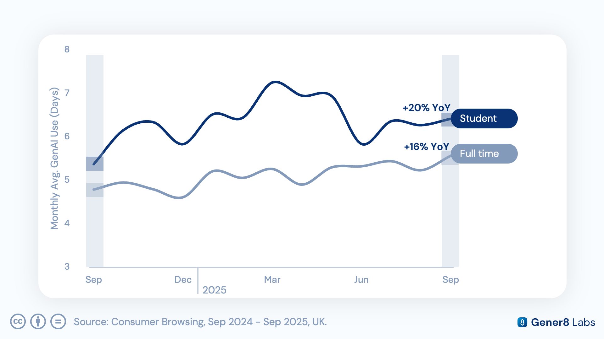 Students emerge from the data as the quintessential power-users of Generative AI. They not only represent the highest-frequency user group at 6.4 days per month, but their adoption is also accelerating at the fastest rate, with usage up 20% compared to the previous year. The data also reveals a clear seasonality to their engagement, with usage patterns coinciding with academic calendars and showing distinct peaks during the crucial study and exam periods from March to April. This directly links their AI use to high-pressure academic activities.